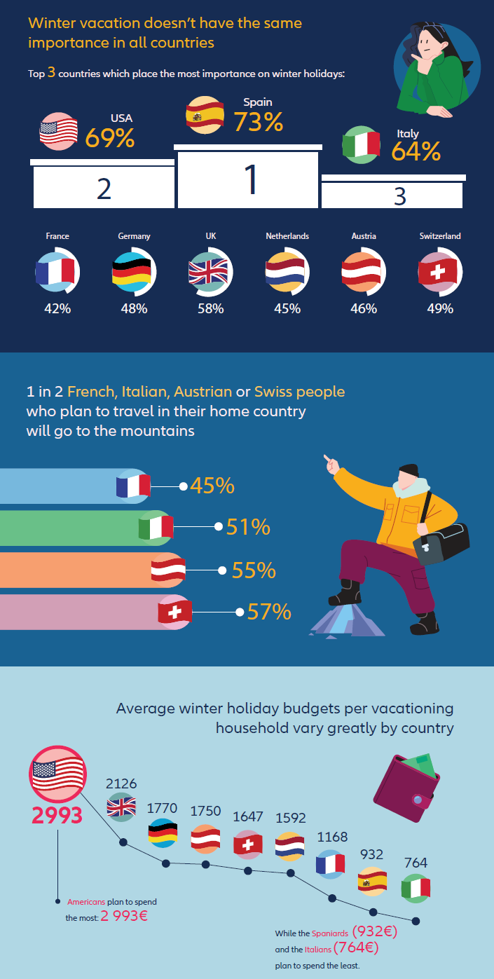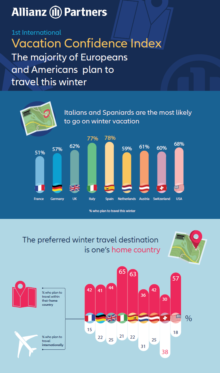 L’International Vacation Confidence Index di Allianz Partners rivela i trend di viaggio per le vacanze invernali grazie ad uno studio condotto su oltre 9.000 intervistati, provenienti da Francia, Germania, Regno Unito, Italia, Spagna, Olanda, Austria, Svizzera e Stati Uniti. Condotto in novembre dall’istituto di ricerca OpinionWay, lo studio esamina intenzioni, destinazioni, previsioni di spesa e fiducia verso la possibilità di viaggiare.