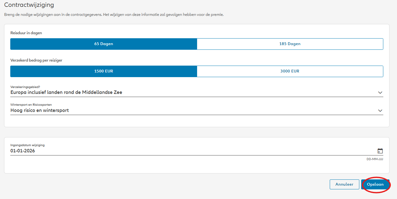 • Dekking annuleringsverzekering: Pas de dekking aan naar €1.500,- of €3.000,-.