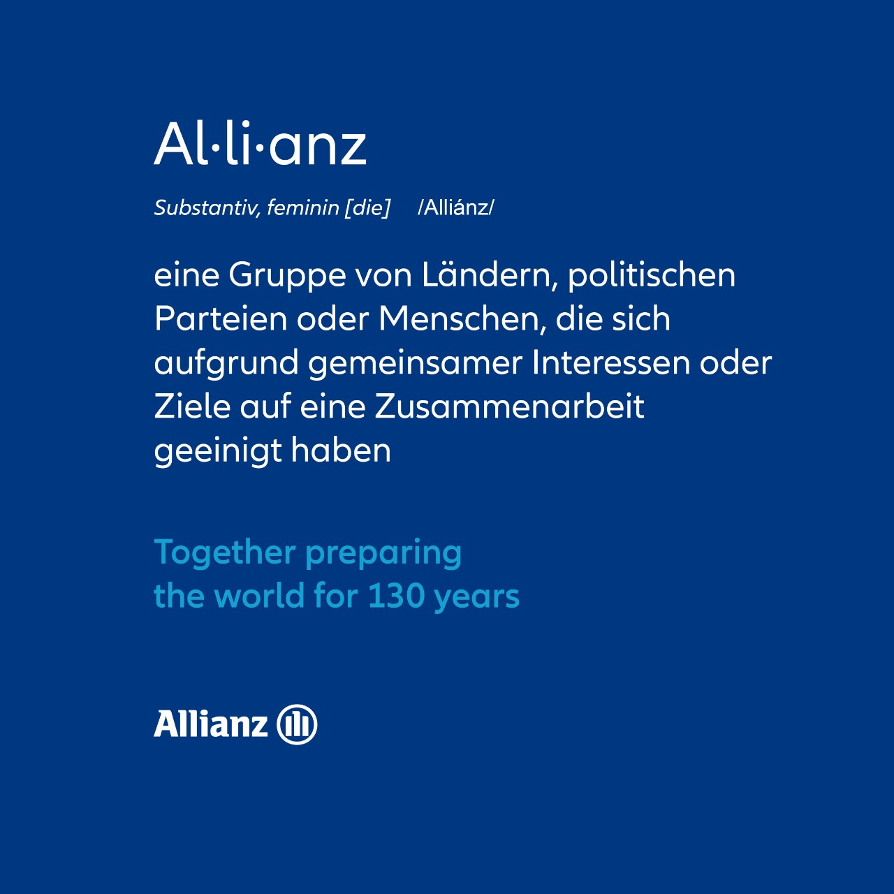 „Allianz“ ist unser Name. „Allianz“ bedeutet, dass wir unseren Kund:innen, unseren Mitarbeiter:innen und denjenigen, die unsere Werte teilen, fest zur Seite stehen und sie unterstützen, eine bessere Welt und eine sichere Zukunft zu gestalten. Wir sind immer da - auch, wenn die Umstände schwierig sind und unser Handeln erfordern.