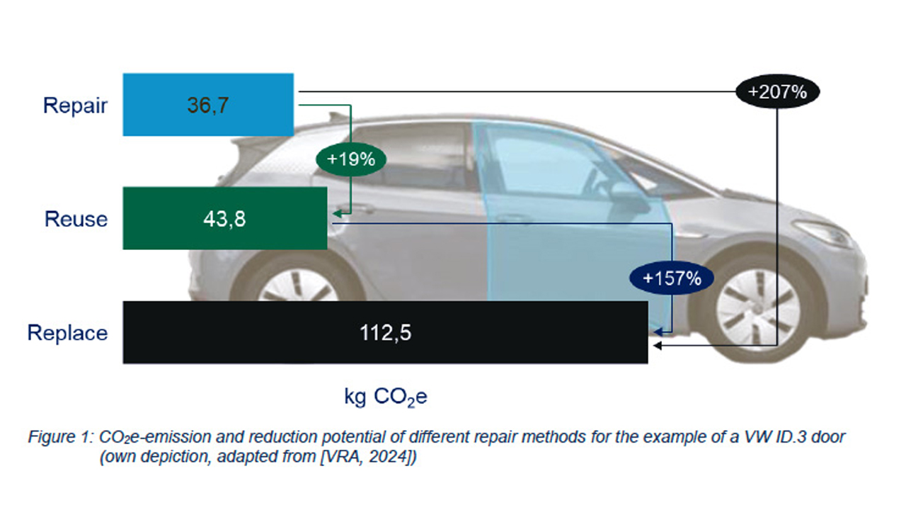 Er weist auch darauf hin, dass die finanziellein Einsparungen erheblich sein können. Die Reparatur einer Seitenverkleidung eines Ford Fiesta spart beispielsweise rund 1.700 US-Dollar. Weitere Vorteile ergeben sich beim Austausch durch ein gebrauchtes Teil. „Der Einbau einer gebrauchten Fahrertür aus einem VW Golf VII würde 89 Prozent oder 81,6 kg CO₂ einsparen.“ [Abb. 2]