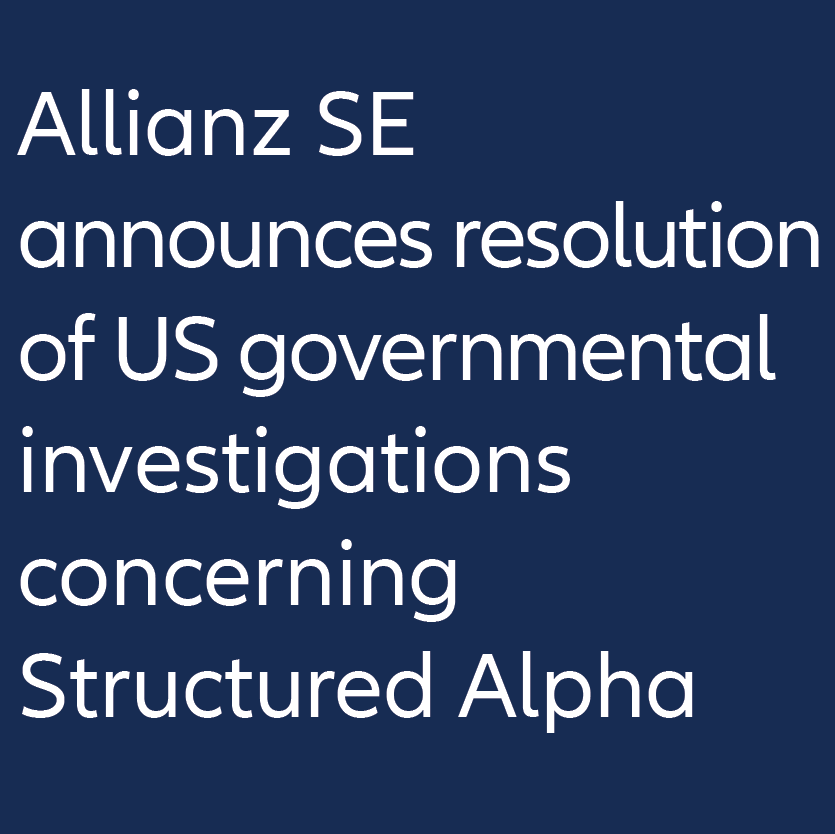 Allianz SE announces that its indirect subsidiary Allianz Global Investors U.S. LLC (“AGI U.S.”) today has entered into settlements with the U.S. Department of Justice (“DOJ”) and the Securities and Exchange Commission (“SEC”) in connection with the Structured Alpha matter.