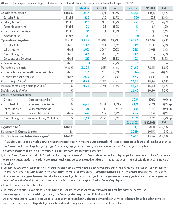 4Q 2022: Das operative Ergebnis wuchs um 12,7 Prozent auf 4,0 (3,5) Milliarden Euro, bedingt durch den Geschäftsbereich Lebens- und Krankenversicherung, aufgrund einer höheren Marge aus Kapitalanlagen in der Lebensversicherung in Deutschland sowie eines positiven Beitrags von Rentenprodukten in den USA. Dies wurde teilweise durch ein niedrigeres operatives Ergebnis im Geschäftsbereich Schaden- und Unfallversicherung aufgrund einer Normalisierung der Schadenhäufigkeit und höherer Schadeninflation der Basisschäden ausgeglichen. Darüber hinaus verringerte sich das operative Ergebnis des Geschäftsbereichs Asset Management durch geringere Erträge aus dem verwalteten Vermögen und erfolgsabhängige Provisionen.