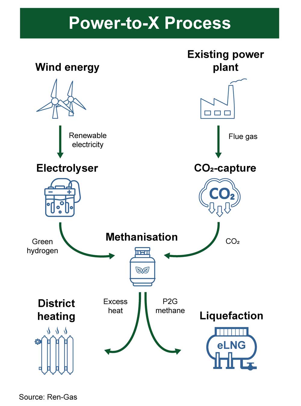 Das Hauptprodukt der Ren-Gas-Anlagen ist synthetisches Methan, das aus erneuerbaren Energien, grünem Wasserstoff und abgeschiedenem Kohlendioxid hergestellt wird. Ren-Gas wird grünen Wasserstoff herstellen und dabei Energien von lokalen Windparks für die Elektrolyse nutzen. Bei der anschließenden Methanisierung wird der grüne Wasserstoff mit dem abgeschiedenem biogenem (aus natürlichem Ursprung) Kohlendioxid aus Fernwärmeanlagen, die überwiegend erneuerbare Brennstoffe verwenden, kombiniert. Gleichzeitig wird die dabei entstehende überschüssige Prozesswärme an das Fernwärmenetz zurückgegeben. Da synthetisches Methan eine ähnliche chemische Zusammensetzung wie Biomethan oder Erdgas aufweist, kann es als Kraftstoff für z.B. den Schwerlastverkehr, Schiffe und auch für die Wärmeerzeugung verwendet werden. So wird durch dieses Verfahren erneuerbares Methan aus Wasser, Windenergie und abgeschiedenem CO2 hergestellt.
