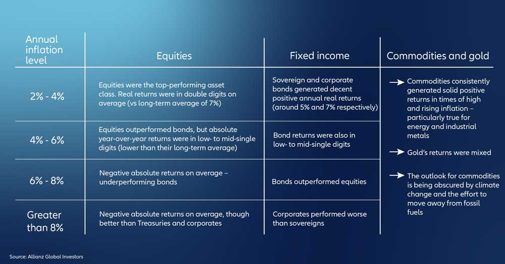 Wenn wir jetzt investieren oder Investitionen in Erwägung ziehen würden, obwohl wir wissen, dass die Inflation über einen längeren Zeitraum erhöht sein wird, wie und auf welcher Grundlage würden wir dann unsere Anlageentscheidungen treffen? Um diese Frage zu beantworten, hat Allianz Global Investors (AllianzGI) untersucht, wie verschiedene Arten von Anlagen in sehr unterschiedlichen Inflationsumfeldern von 1971 bis heute reagiert haben.