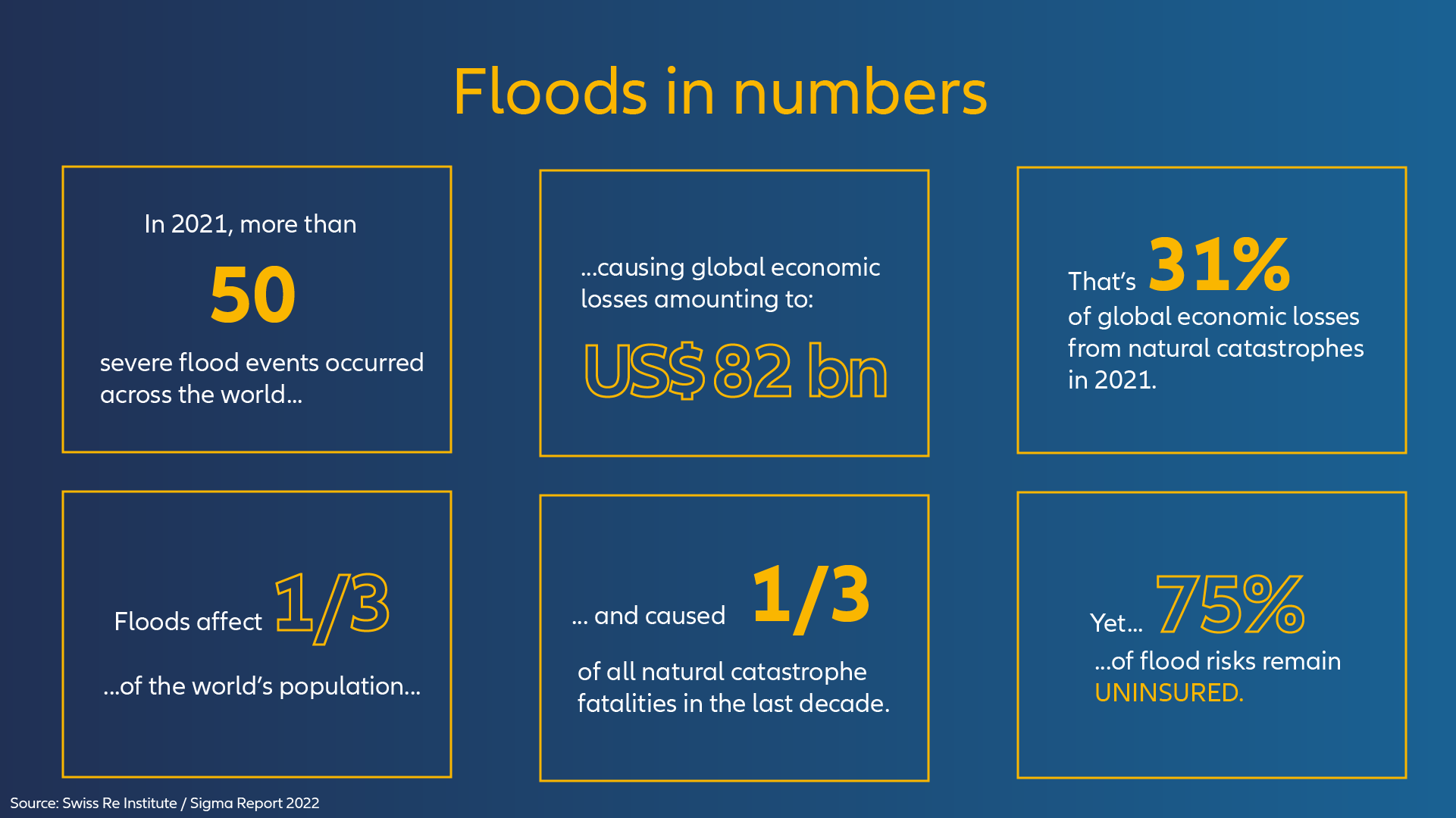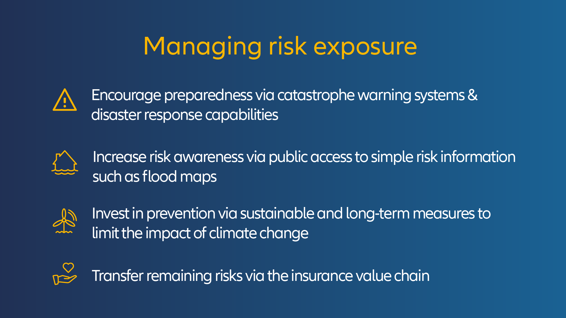 - Der Klimawandel schafft Risiken in einem noch nie dagewesenen Ausmaß. Zwar müssen die Versicherer weiterhin Deckungsoptionen auf der Grundlage genauer Risikobewertungen in und außerhalb von Überschwemmungsgebieten fördern und entwickeln, doch damit endet die Bestimmung der Versicherungsunternehmen nicht.