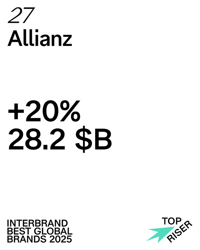 Die Allianz hat sich erneut als eine der wertvollsten Marken weltweit bewährt und ist zum siebten Mal in Folge die erfolgreichste Versicherungsmarke. Im Ranking der „Best Global Brands 2025” von Interbrand ist die Allianz um zwei Plätze auf Rang 27 geklettert, wobei der Markenwert um 20 % auf 28,2 Milliarden US-Dollar gestiegen ist, was die Allianz zu einem der Top-Aufsteiger des Jahres macht. Diese Ergebnisse sind auf eine starke finanzielle Performance und Kundenorientierung in Verbindung mit einer Steigerung der Markenstärke durch eine konsequent umgesetzte globale Markenstrategie hin zu einer Marke in Aktion zurückzuführen.
