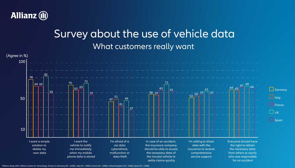 With two-thirds of all respondents agreeing, approval is highest of data use for clarifying accident blame. For example, 69 percent (UK), 67 percent (France), 66 percent (Spain), 64 percent (Germany), and 63 percent (Italy) agree with the statement that every party involved should have the right to receive the data necessary for this purpose. “Our survey shows that there is a very positive view of the benefits of data recording for accident investigation,” says Jörg Kubitzki, safety researcher at the Allianz Center for Technology (AZT) and co-author of the study.