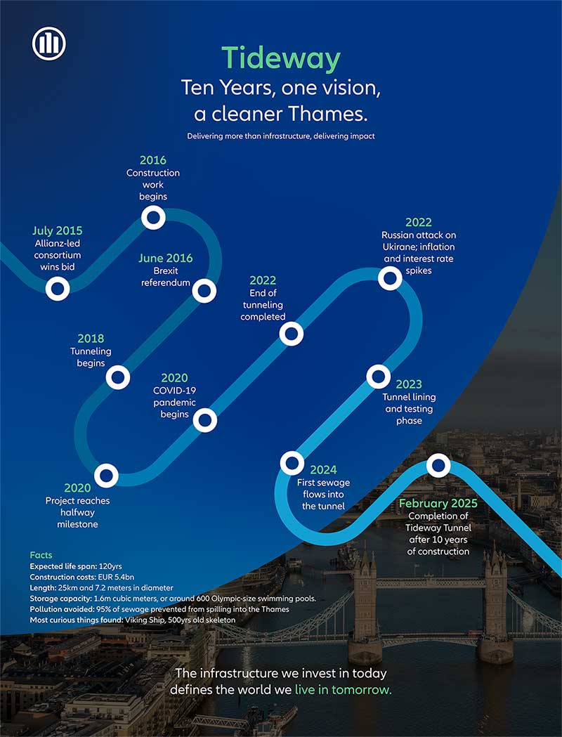 Andreas Lindner: Planning for the future involves looking ahead over many years and even decades. Those who start planning in their youth and later derive a lifelong income from it are looking well into the second half of this century. As a life insurer, Allianz accompanies its customers over decades, aligning its investments for the long term and with stable value. Projects like Tideway, with a long duration fit perfectly into this approach. Allianz is celebrating its 135th anniversary this year – we have a lot of experience with long-term projects.